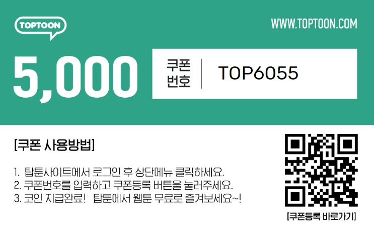 탑툰 무료 쿠폰 코드는TOP6055 입니다. top6055만 입력해도 5000원 상당 탑툰 코인을 받을 수 있습니다.