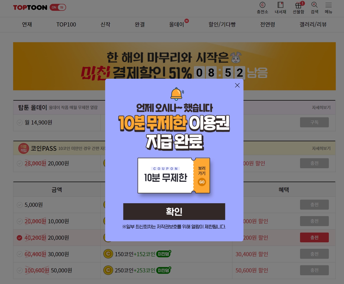 탑툰 올데이 정액권은 올데이 작품에 한하여 매월 무제한 열람을 할 수 있고, 결제할인 51%도 상시 진행합니다. 추천 결제 옵션은 20,000원입니다. 101코인 덤에 50코인을 추가로 얻을 수 있어요.