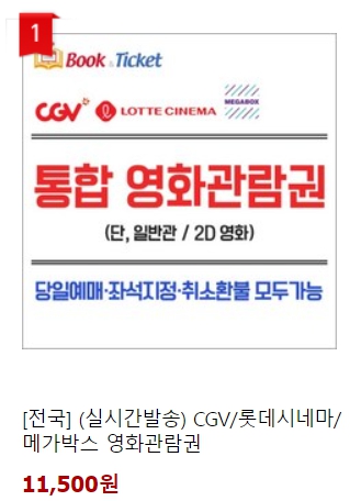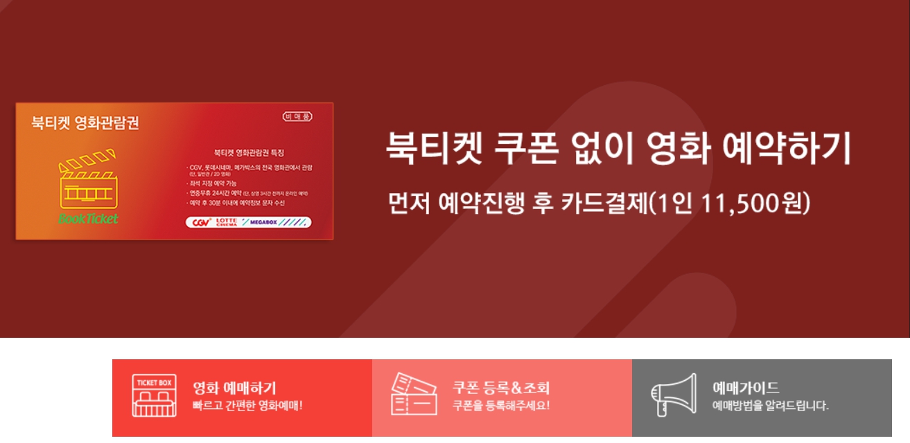 쿠팡에서 북티켓 통합영화관람권 롯데시네마, CGV, 메가박스 11,500원 결제하고 쿠폰을 받아 북티켓 사이트에서 별도 예매를 하는 방법이 있습니다.