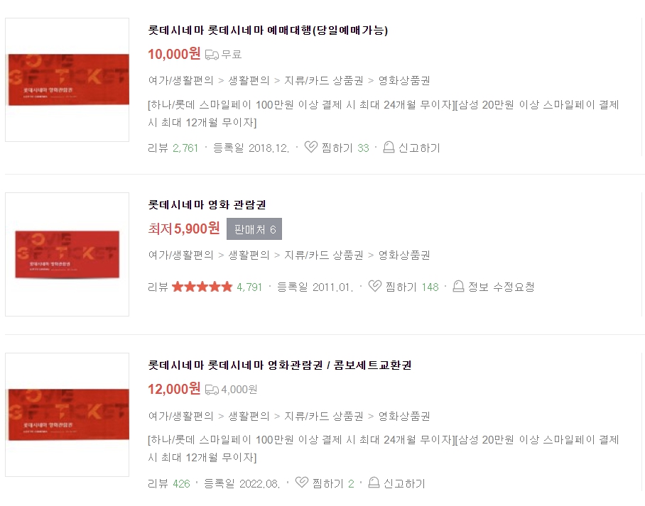 네이버쇼핑에서 '롯데시네마 예매권' '관람권' 등으로 검색하면 10,000원 ~ 11,000원으로 구입 가능하며 당일 예매 가능한 예매대행 방식입니다. 문자로 구매자 인증하고 대행사 통해서 예매권 받는 구조라 귀찮아요. 반값이면 모르는데 3,000원 할인 밖에 안됩니다