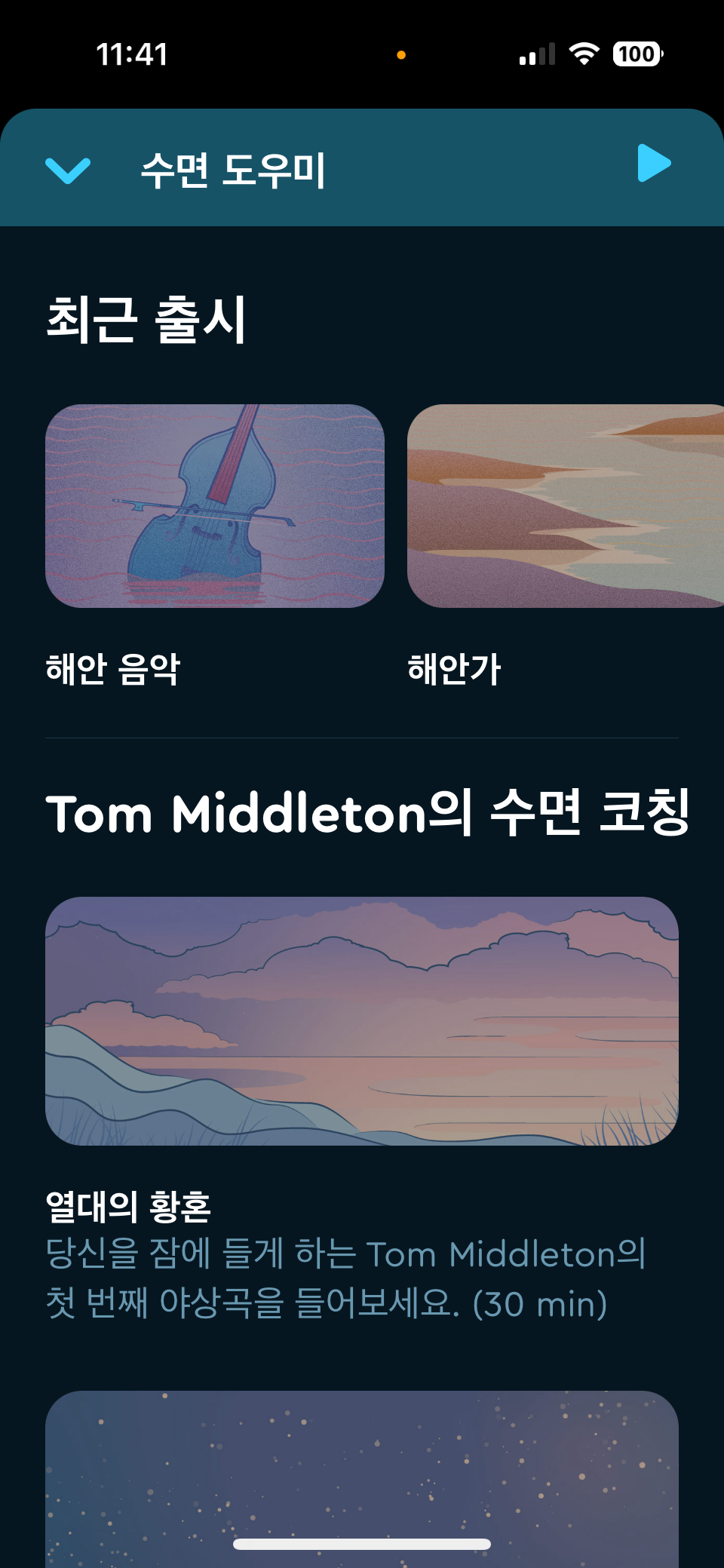 ⑤ 슬립사이클 자체 수면 음악, 명상, ASMR, 백색 소음 등을 제공하여 보다 잠자기 좋은 환경을 제공한다.