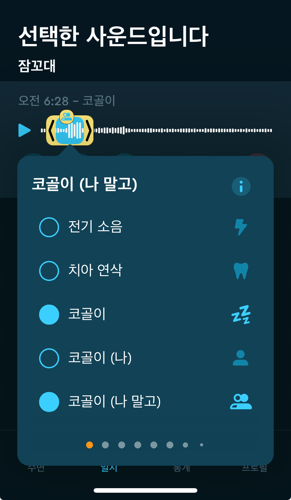 아이폰 수면어플 슬립사이클 수면 일지 화면이다. 깨어남, 수면, 깊은 수면 단계를 확인할 수 있다. 여러 명이서 잘 경우 코골이, 재채기 등 다른 사람의 소리도 섞일 수 있다. 이때 코골이의 경우 '나' '나 말고' 이렇게 라벨링할 수 있다.