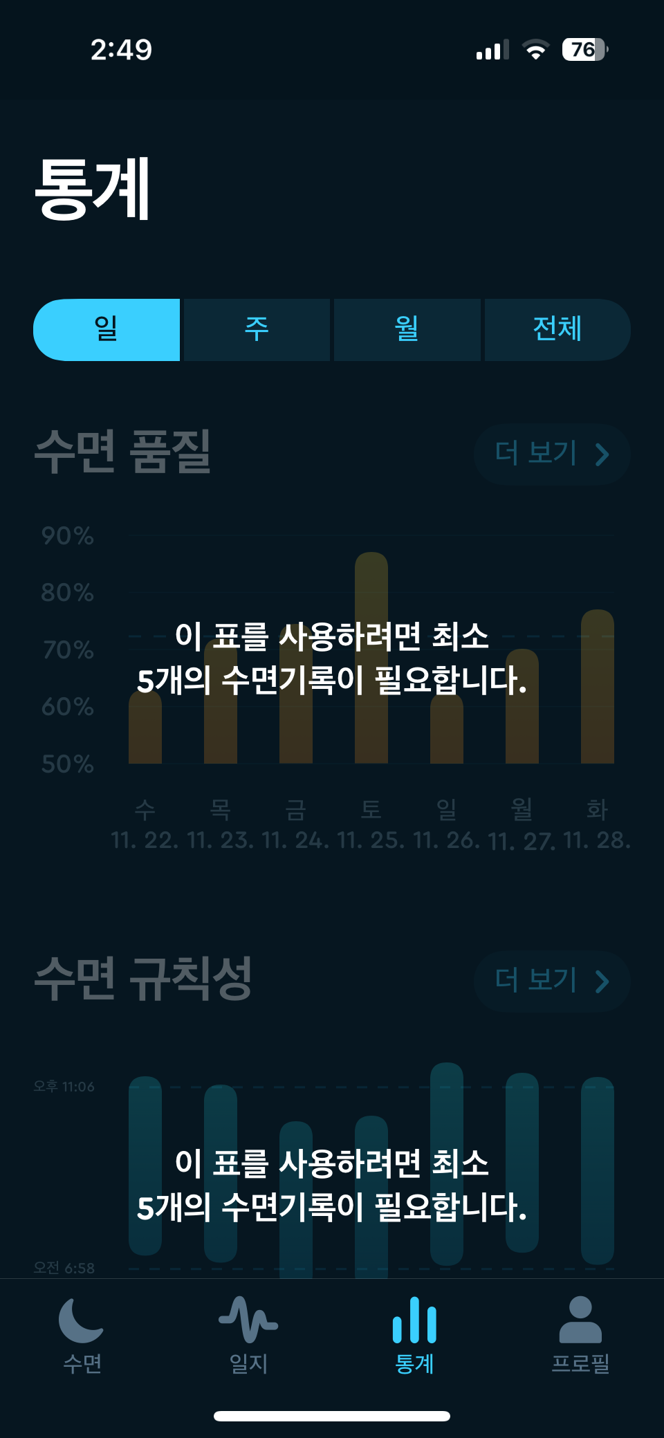 5일 동안 슬립사이클 기록이 끝나면 '통계' 기능을 이용할 수 있다. 통계는 일, 주, 월, 전체 기간 동안 수면 품질, 수면 규칙성, 취침시간, 기상시간, 효율성, 침대에서 보낸 시간, 수면 시간, 잠들기까지 걸린 시간, 코골이, 주변 소음, 심박수, 체온, 걸음수, 호흡장애 등을 확인할 수 있다.