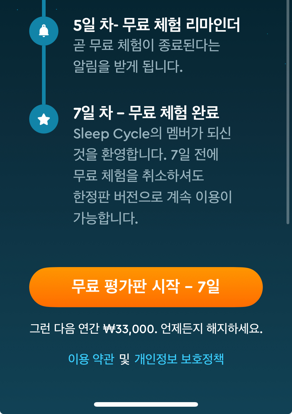 ⑦ 7일 전에 무료 체험을 취소하여도 한정판 버전으로 계속 이용이 가능하다. 7일 전 언제든지 해지할 수 있다. 슬립사이클 연간 구독권은 33,000원이다. 슬립사이클 PC 결제는 별도로 없고 어플 상에서 결제할 수 있다.